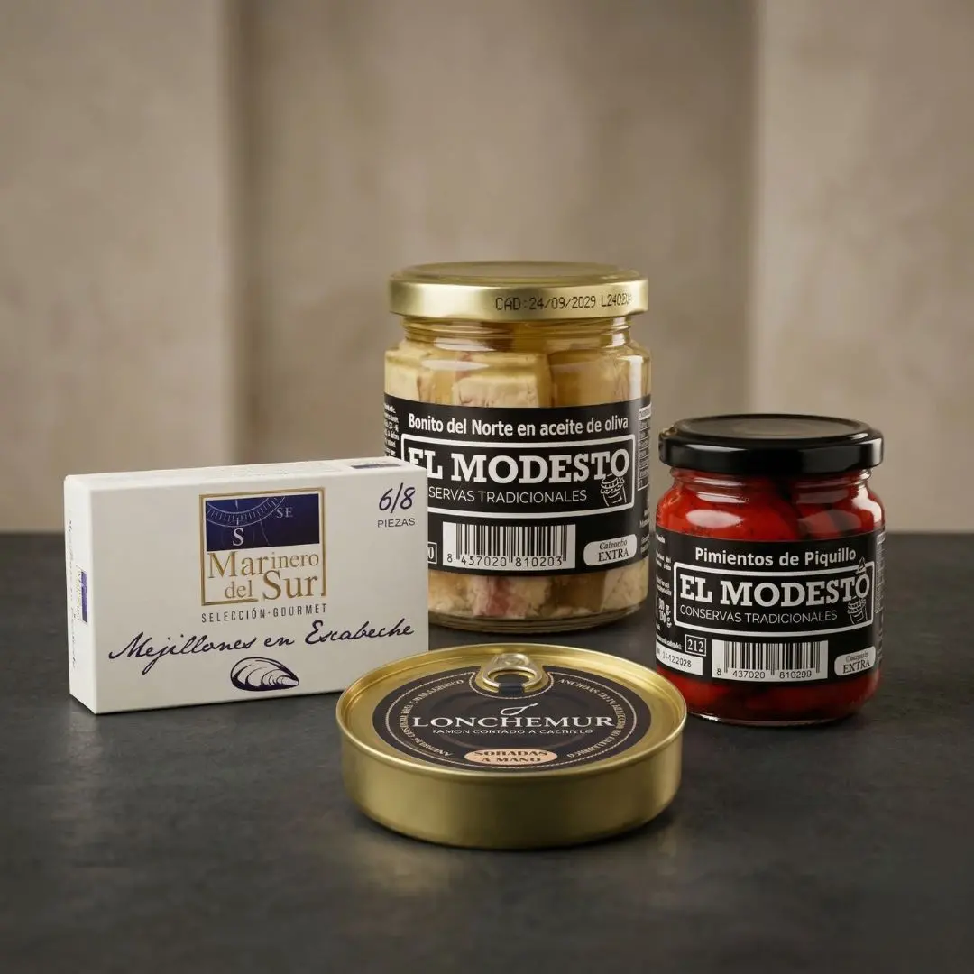 Mejillones en escabeche, sardinillas, bonito del norte, frutos secos selectos, anchoas del Cantábrico y mucho más. El tipo de conserva que se regala, no que se compra por costumbre.