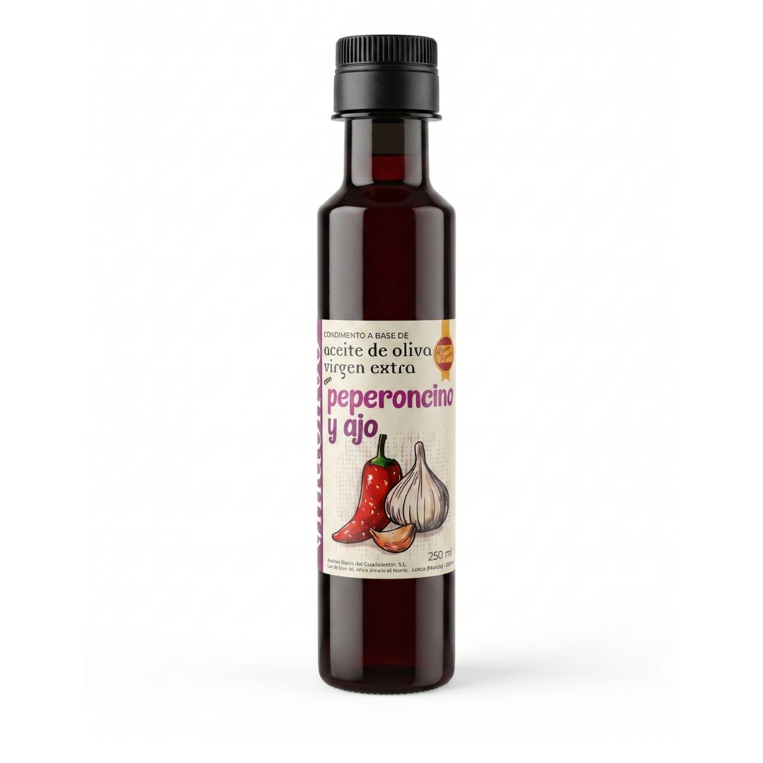 Tipo: Condimento a base de Aceite de Oliva Virgen Extra con Ajo y Peperoncino Método de elaboración: Molturación conjunta de aceitunas, ajo y peperoncino Nivel de picante: Bajo Formato: 250 ml en frasco de vidrio Origen: España Fabricante: Productos Mediterráneo Belchí Salas, S.L. · Alhama de Murcia, Murcia Apto para: Veganos · Vegetarianos · Sin gluten 100% Natural