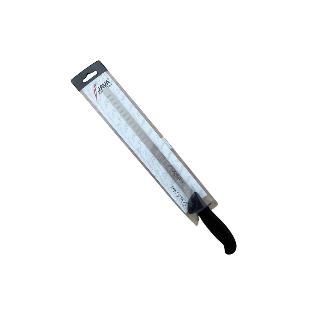 Diseñado específicamente para el corte de jamón y paleta, el cuchillo Java destaca por su hoja larga, estrecha y flexible, lo que permite obtener lonchas finas, regulares y sin esfuerzo. Ya seas un aficionado del ibérico o un profesional del loncheo, este cuchillo te garantiza una experiencia de corte cómoda, segura y eficaz.