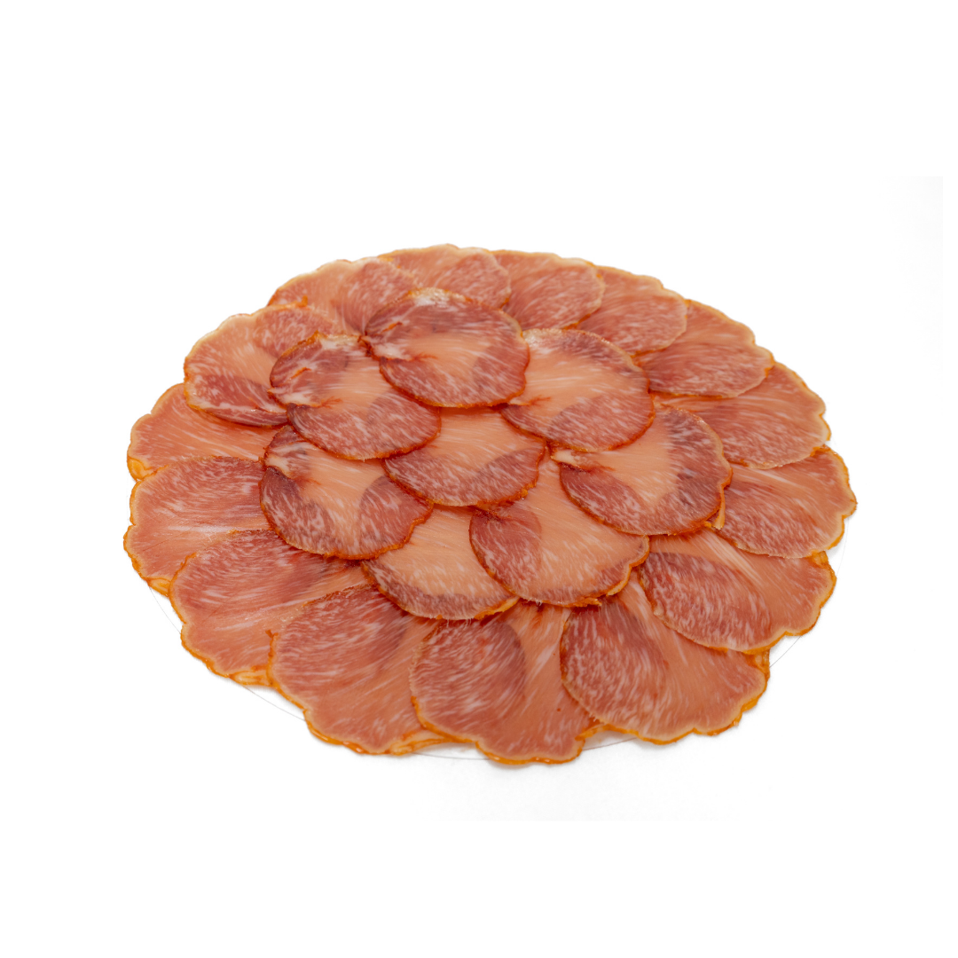 Este proceso lento permite que el embutido desarrolle todos sus aromas sin perder su textura jugosa. El resultado es una pieza con color rojizo brillante, corte limpio, aroma especiado y sabor auténtico.