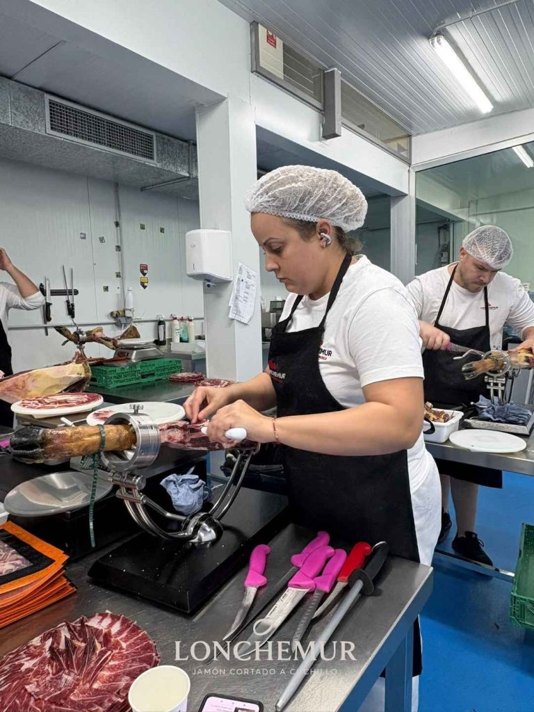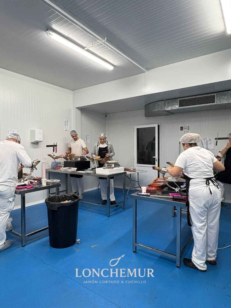 Cada jamón que entra en la sala blanca es inspeccionado, valorado y trabajado de manera individual. Nuestro equipo se encarga de extraer el mejor rendimiento de cada pieza, cuidando tanto el corte como la estética final del producto. Este proceso minucioso es una de las señas de identidad de Lonchemur.